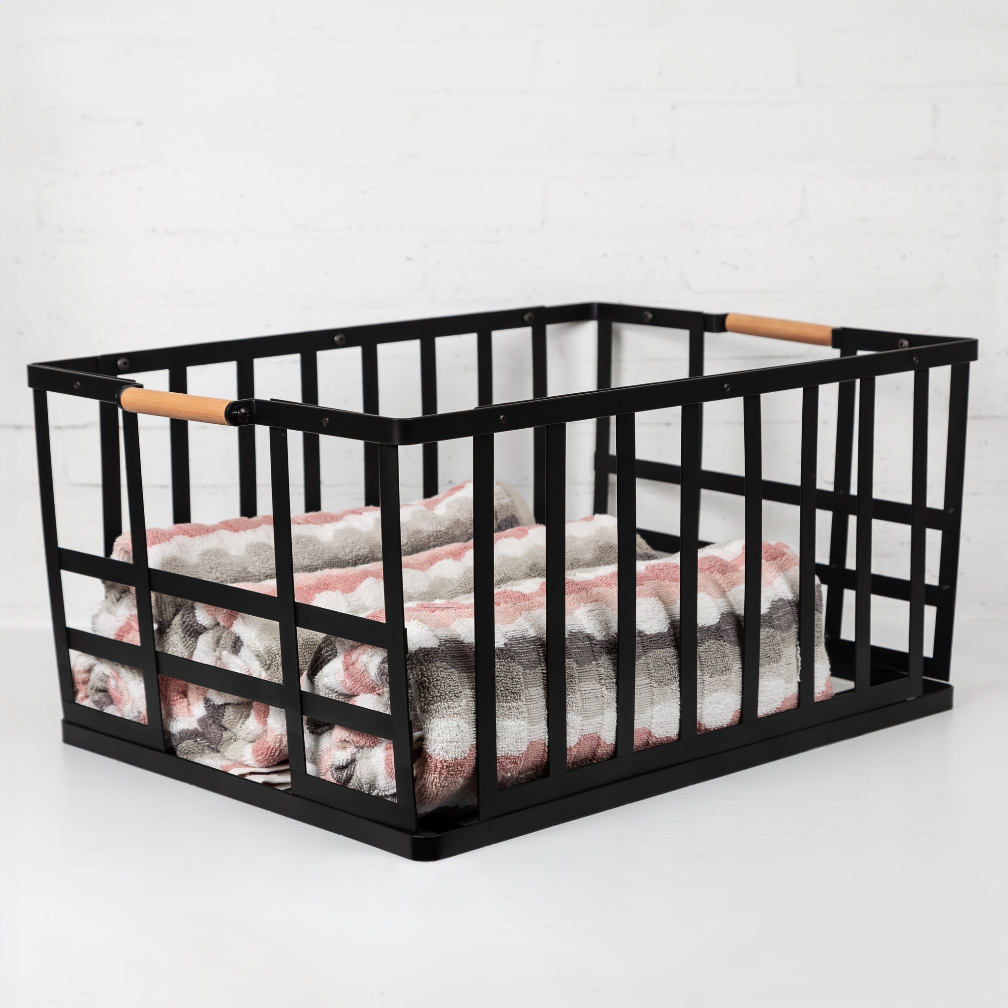 Clean up all the clutter in your home with these beautiful black storage baskets. They have a wooden handle and are so versatile you could even use them in the office, linen bedroom, bathroom, or any handy storage solution you require.