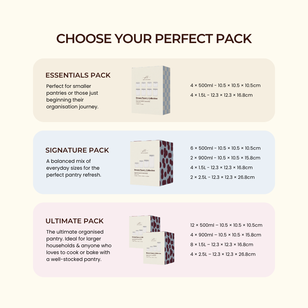 It's important to choose containers that not only fit the quantity of the product but also maximize the use of space in your pantry. Download our free cheat sheets or read our blog on container jar sizes to make an informed choices for your storage needs.