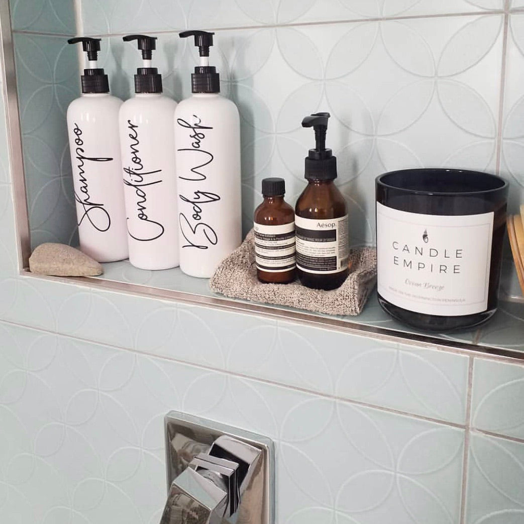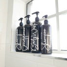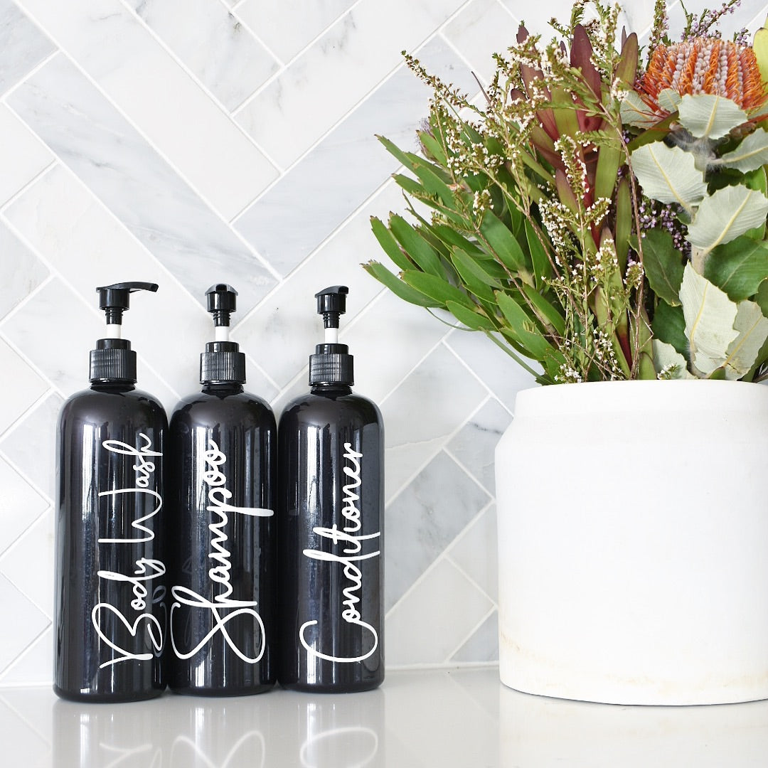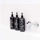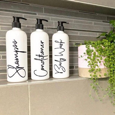 Inspired by high end commercial cosmetics and fancy soaps and lotions, the labels give a touch of class to any re-usable bottle.